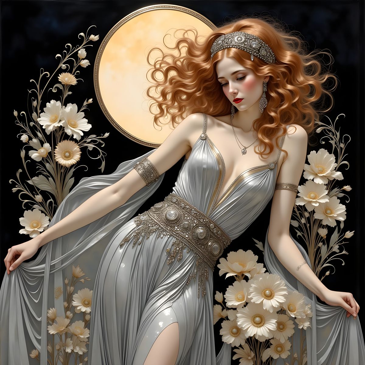 This image features a dreamy Art Nouveau woman with auburn hair, wearing a shimmering silver gown and ornate jewelry. The scene is set against a midnight sky with a glowing moon, rendered in a metallic watercolor style.