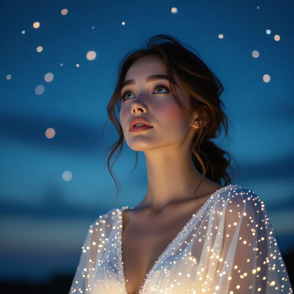 This image shows a fair-skinned woman in a glowing gown, looking up at a twilight sky filled with stars. The cinematic aesthetic includes film grain and color-graded lighting.
