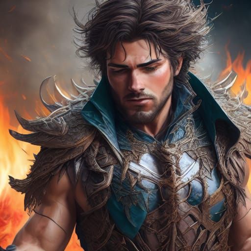This image features a young man clad in intricate, fiery armor. The AI generated artwork depicts a powerful warrior composition.