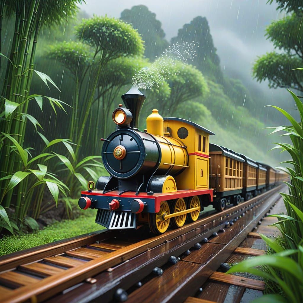 a whimsical and surreal scene of a large classic wooden bamboo toy train on a wood track, in a dreamy, fantastical rain setting, hyperrealistic, intricately detailed in an anime style