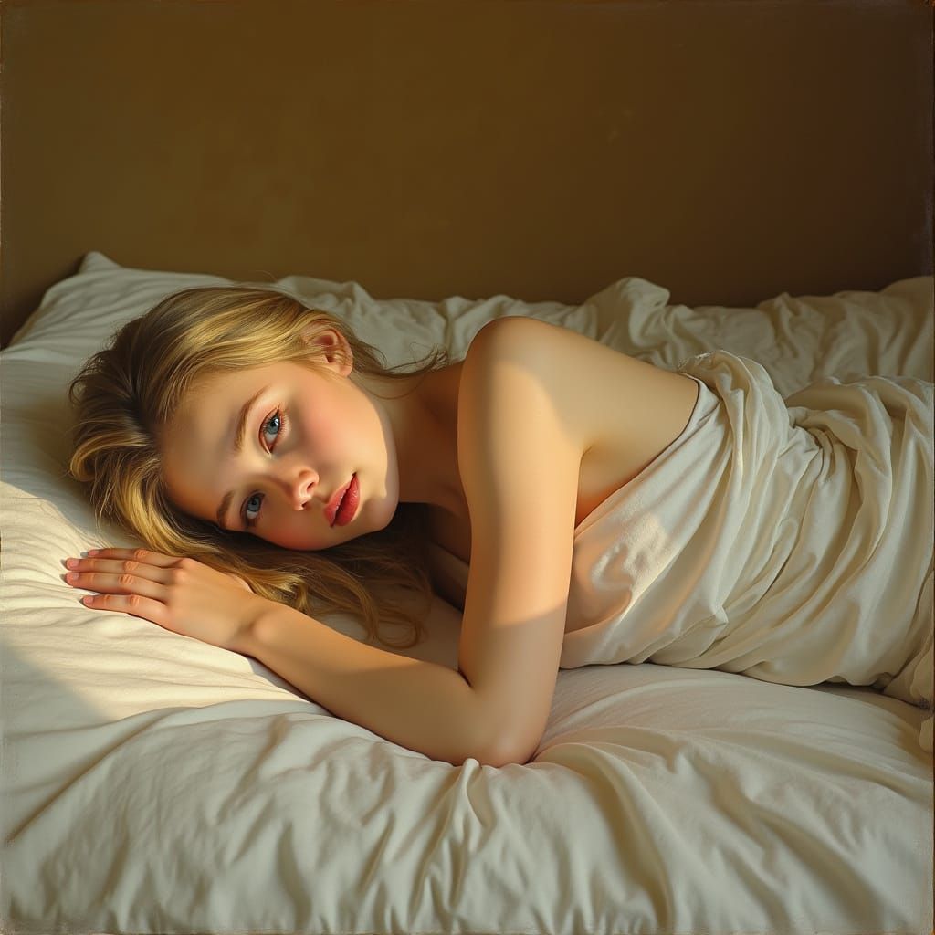 This beautiful painting shows a young woman at peace, her serene expression and delicate curves a testament to the artist's masterful brushwork and use of warm, golden tones. Her large, deep blue eyes convey immense tenderness and innocence.