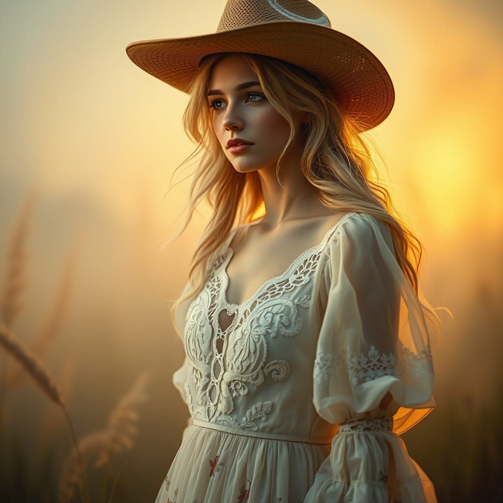 A serene cowgirl woman lost in thought, surrounded by a soft mist, in a warm, golden light, reminiscent of dreamy landscapes and fantasy art.