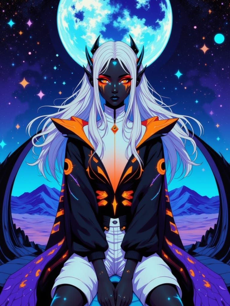 <lora:Radiance:1.0> <lora:Manga Gothica:1.0> <lora:5E-FL:1.0> <lora:GLiMORiA:1.0> Dark Minimalism. dark cell shaded. vector. Close centered portrait. sitting on a hovering cybernetic throne above a starlit desert, a female woman, long white hair, black and orange asymmetrical glass bladed crown, orange ...