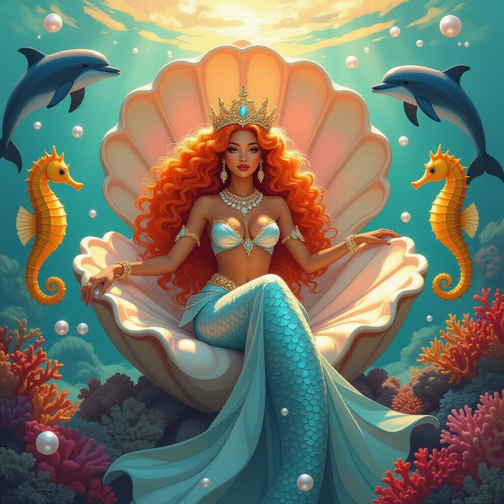 A vibrant concept art image of a mermaid empress with sunset-colored hair. She wears a golden crown and coral jewelry, lounging on a clamshell throne, attended by seahorses and dolphins.