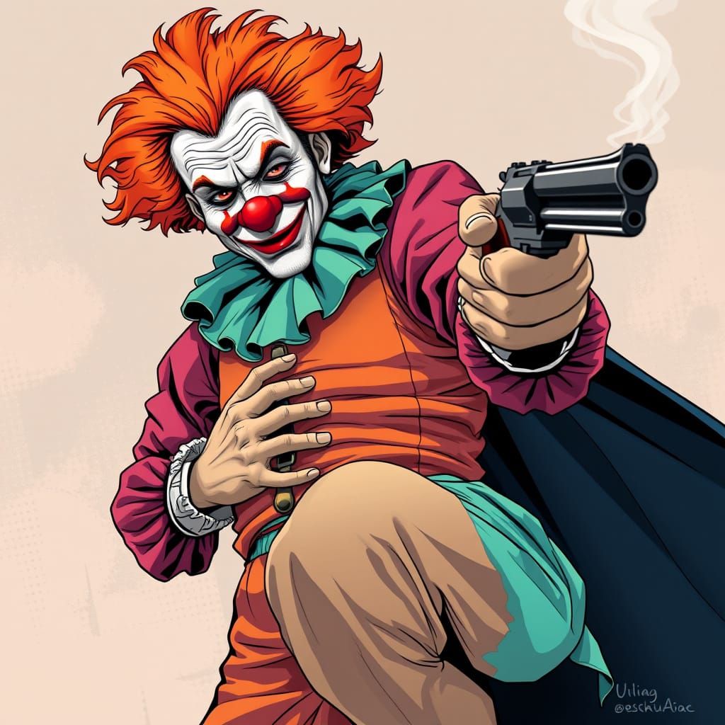 A heroic clown stands resolute, protecting a young girl with his life, as he faces off against an unseen threat. His bold stance and vibrant colors evoke a sense of comic book drama and action.