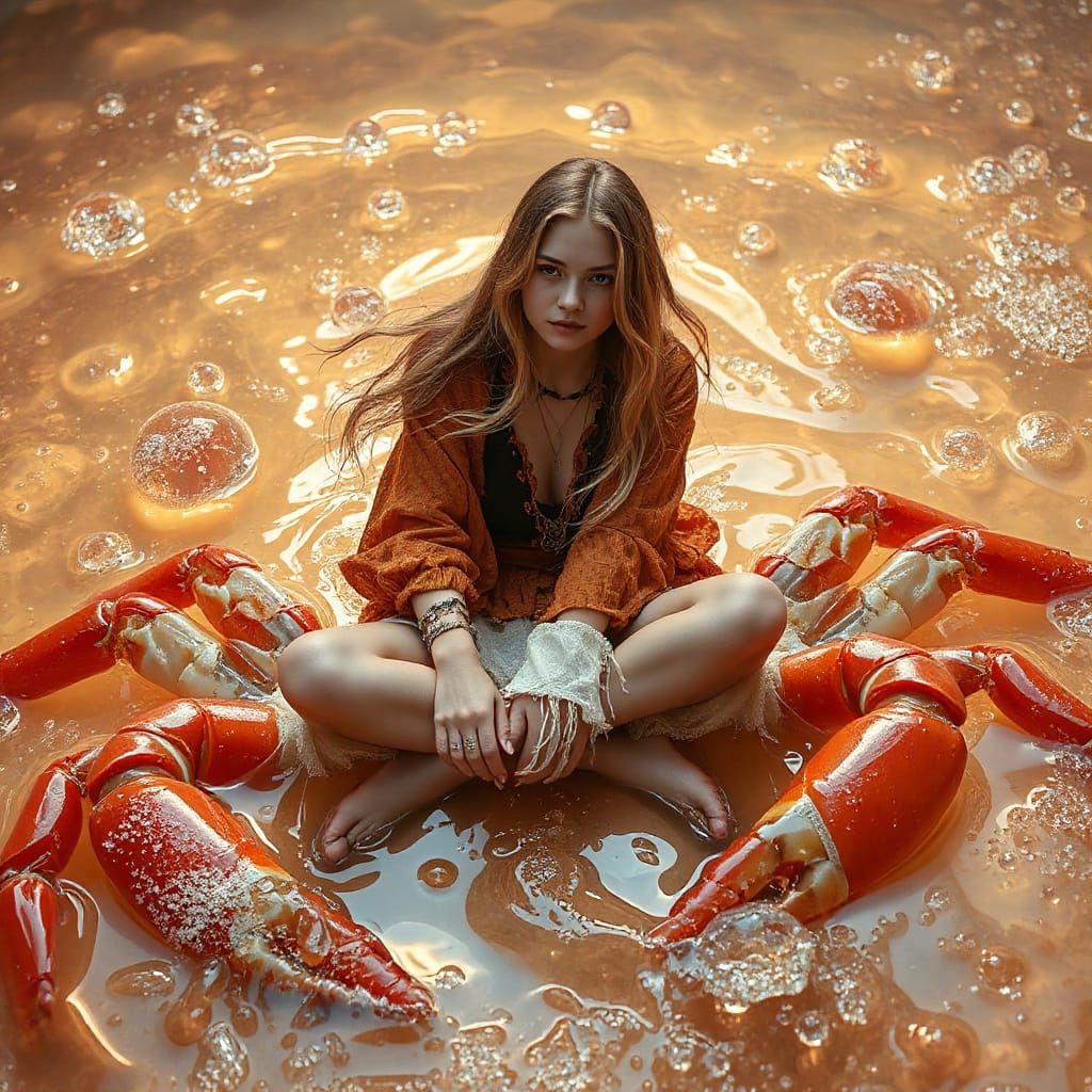 A dreamlike scene of a woman with golden hair in bohemian clothes on a giant gummy crab, surrounded by effervescent soda in warm hues, with shimmering bubbles and soft light.