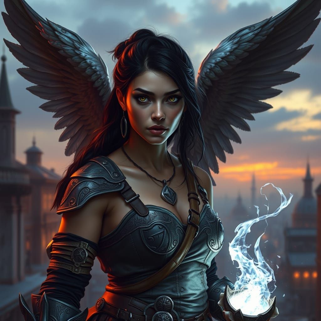 This image shows a shirtless orc woman named Orbul Forebinder in a cityscape at dawn. She has the power to generate solid fire remains, depicted with soft lights in a Niello style.
