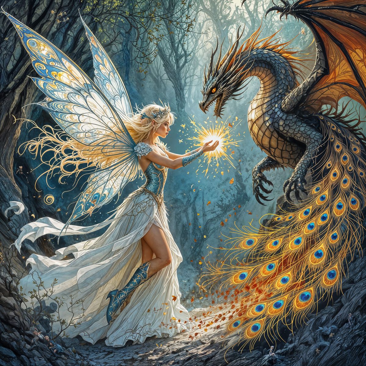 This image depicts a blonde fairy with silver wings in a fierce battle against dragons. Her magical peacocks release pixie dust that turns dragons to stone.