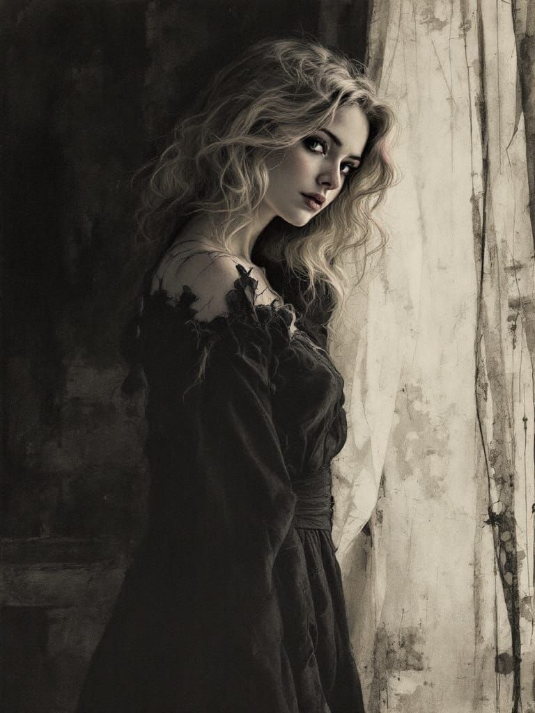This image features a full-body pin-up woman with pink-tipped hair, rendered with profound tonal depth. It combines graphite mastery with intimate naturalism and nostalgic tenderness, creating a sepia-touched, contemplative atmosphere.