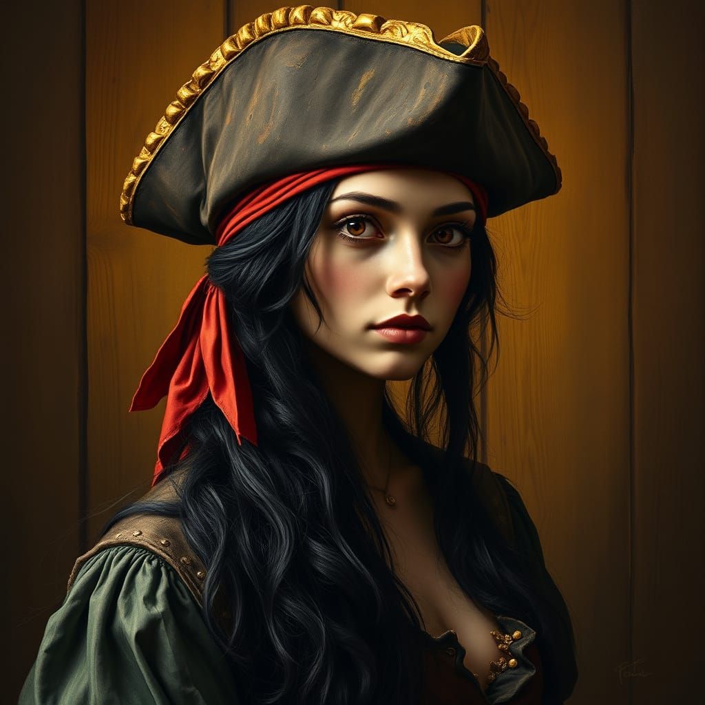This image shows a stunning portrait of a beautiful black-haired pirate woman, set against a warm wooden background with golden light and rich textures, evoking the style of 17th-century Dutch Masters.