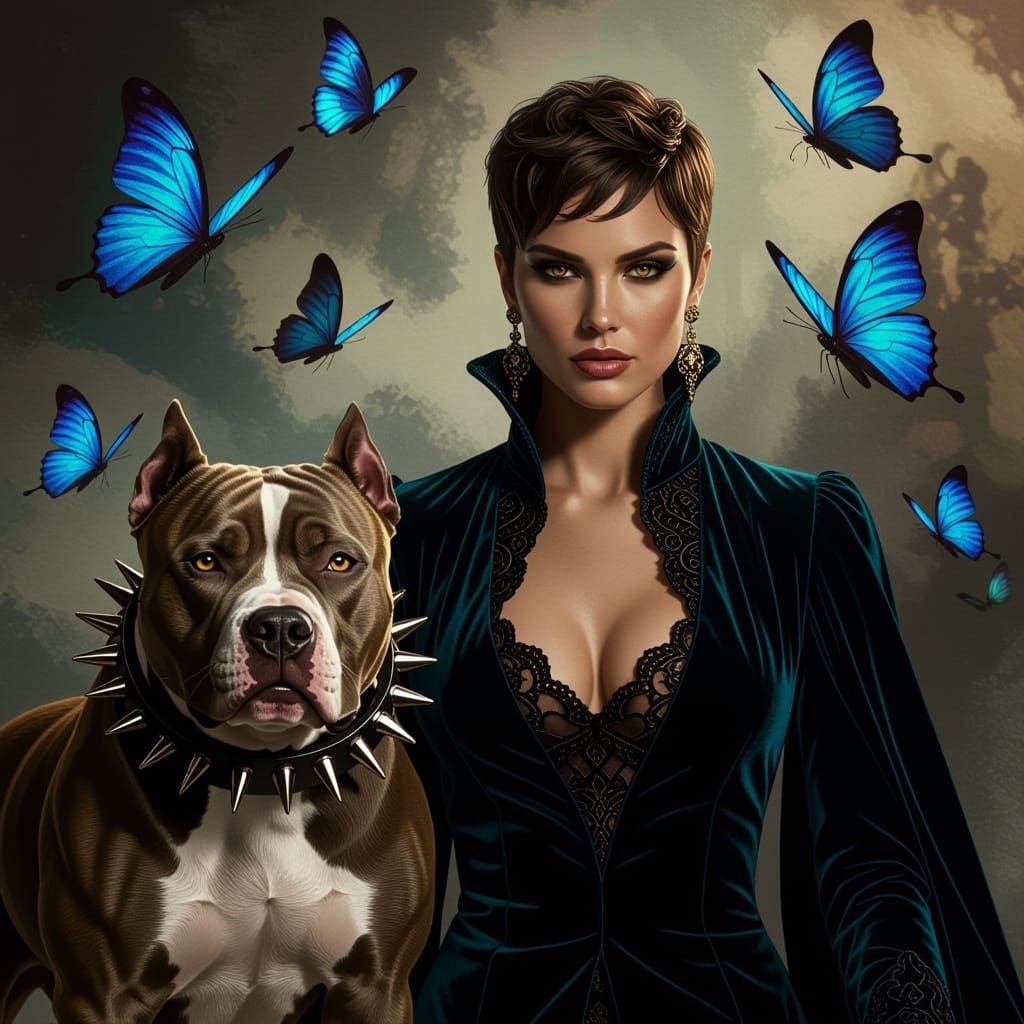 A hyper-realistic digital artwork shows a powerful woman with golden eyes and a pit bull. Ethereal butterflies add a surreal touch to the dramatic, cinematic scene.