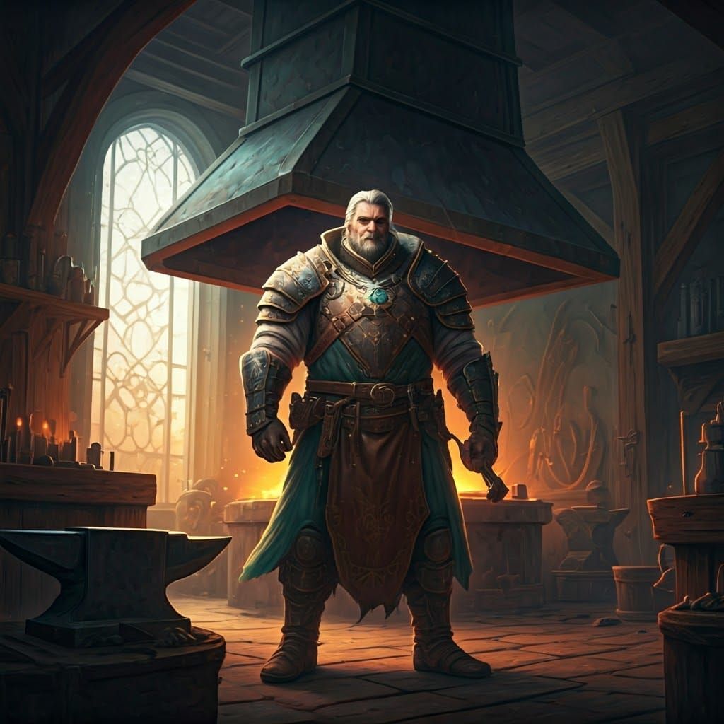 This image showcases a master blacksmith at work in his bustling shop, surrounded by the warm glow of triadic colors and the dynamic lighting of a fantasy world, as if rendered in Unreal Engine 5