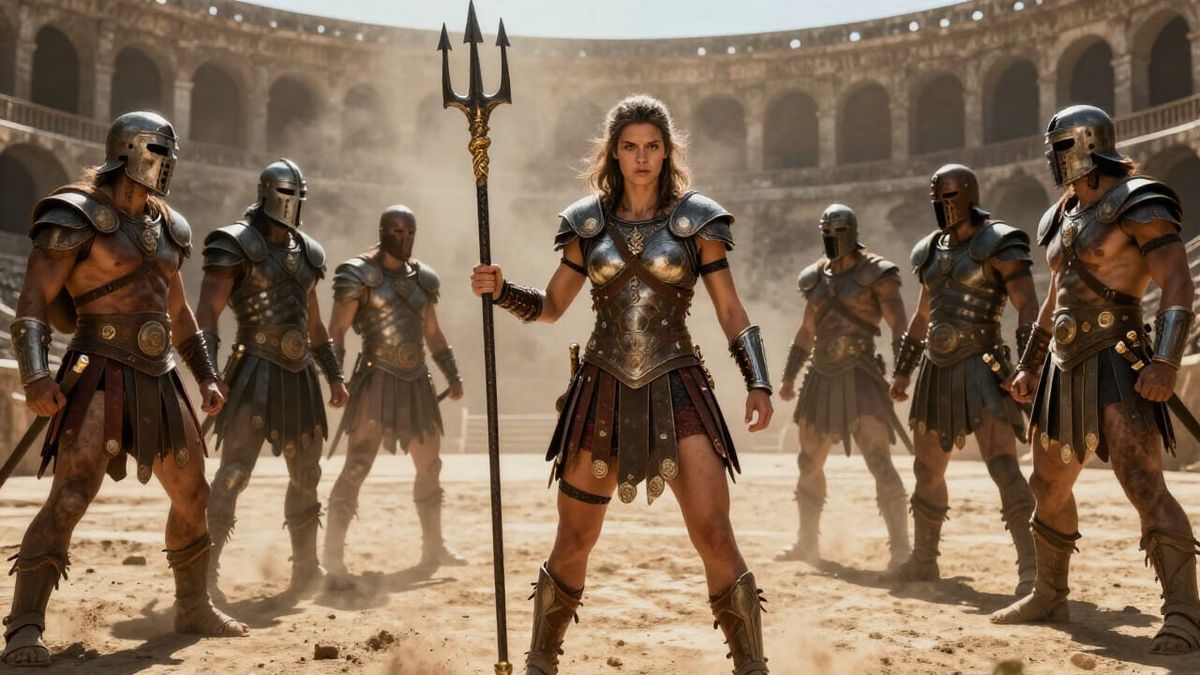 This image shows a fierce, armored female gladiator with a trident, battling seven warriors in a sunlit colosseum. Rendered in a hyperrealistic style with dramatic lighting and earthy tones.