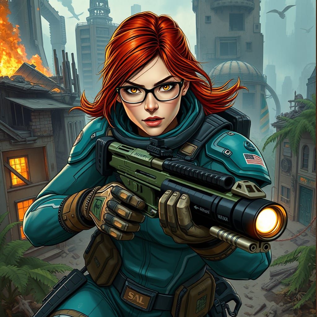 A photorealistic woman with hazel eyes and auburn hair is depicted in a futuristic combat scene. She wears tactical armor and wields a pulse rifle amidst ruins, jungles, and warehouses as a gritty digital painting.