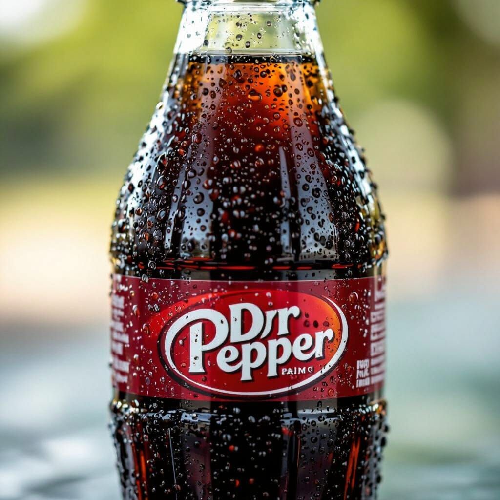 This image shows a macro shot of a cold Dr. Pepper bottle with condensation on a hot day. The photograph features a bokeh effect and sharp focus, using natural lighting to capture the summer scene.