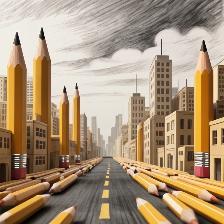 This image depicts a surreal city constructed entirely from pencils. Buildings are pencil-shaped, the roads are made of pencils, and the sky is rendered in graphite.