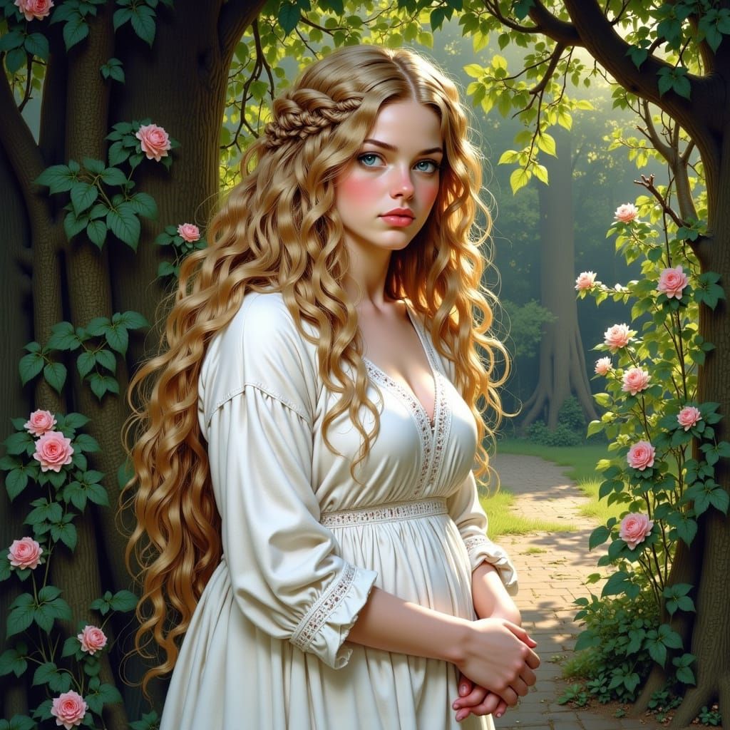 This image depicts a full-figured woman with long blonde curls in a white tunic, serene in a French garden circa 1616. Rendered in a romantic rococo style with soft, pastel colors.