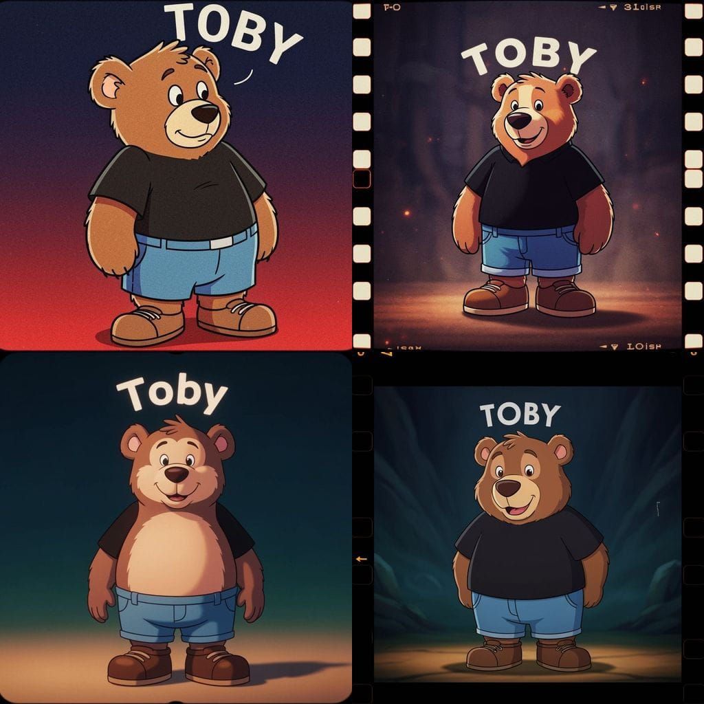 A cartoon-style image of an anthropomorphic bear standing upright. The bear wears brown shoes, blue shorts, and a black shirt, with the name "Toby" displayed above its head. Rendered with cinematic lighting.
