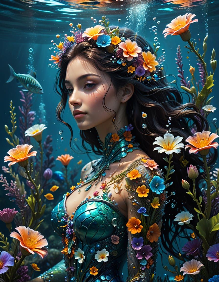 A striking picture of a mermaid surrounded by vibrant flowers in a fantastical underwater world. The image features shimmering scales, an iridescent tail, and organic textures, all rendered in digital art with intricate details and a dreamy aesthetic.