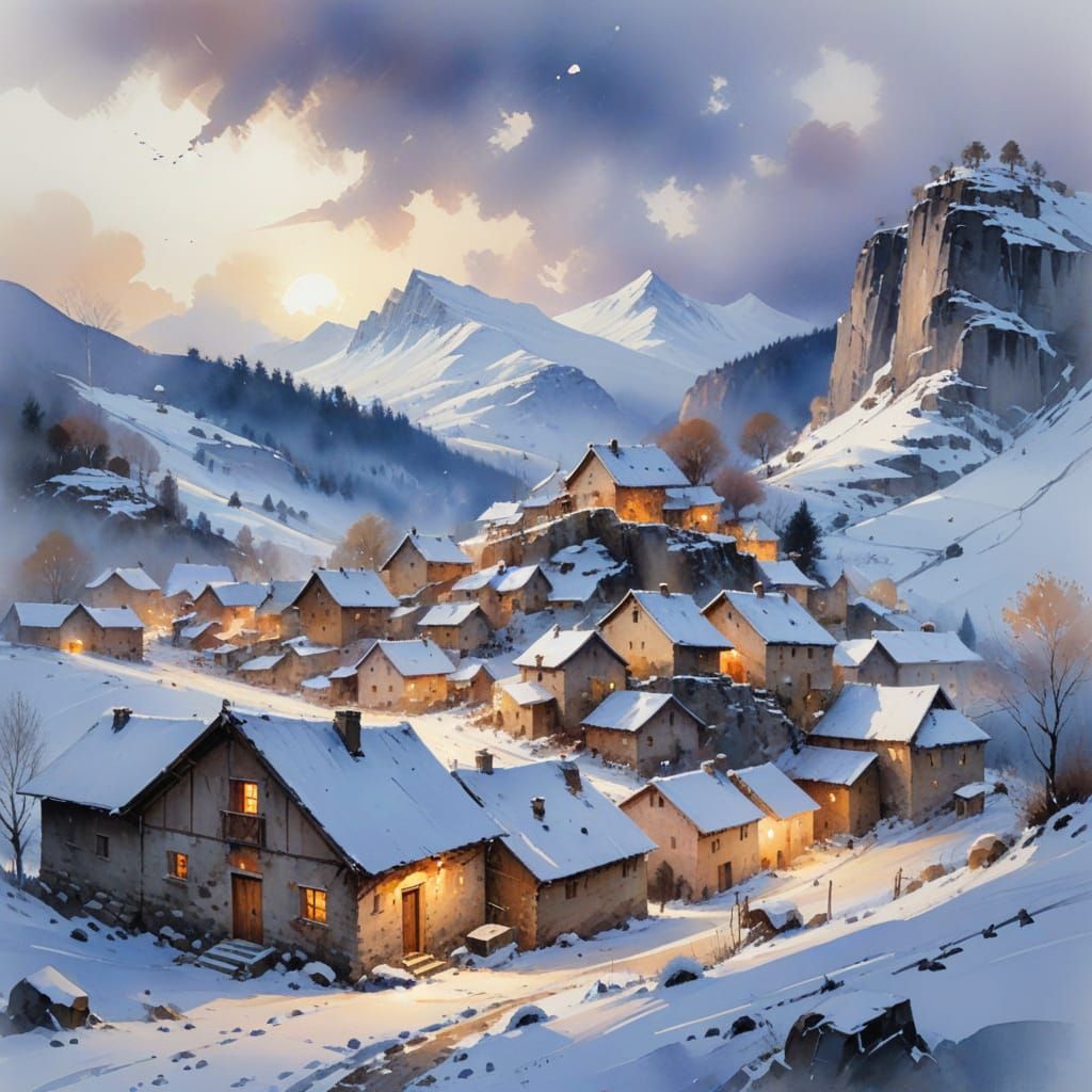 A watercolor image of a remote mountain village at dawn. The artwork blends expressive watercolor techniques with cinematic stylization, creating a mesmerizing fusion of styles.
