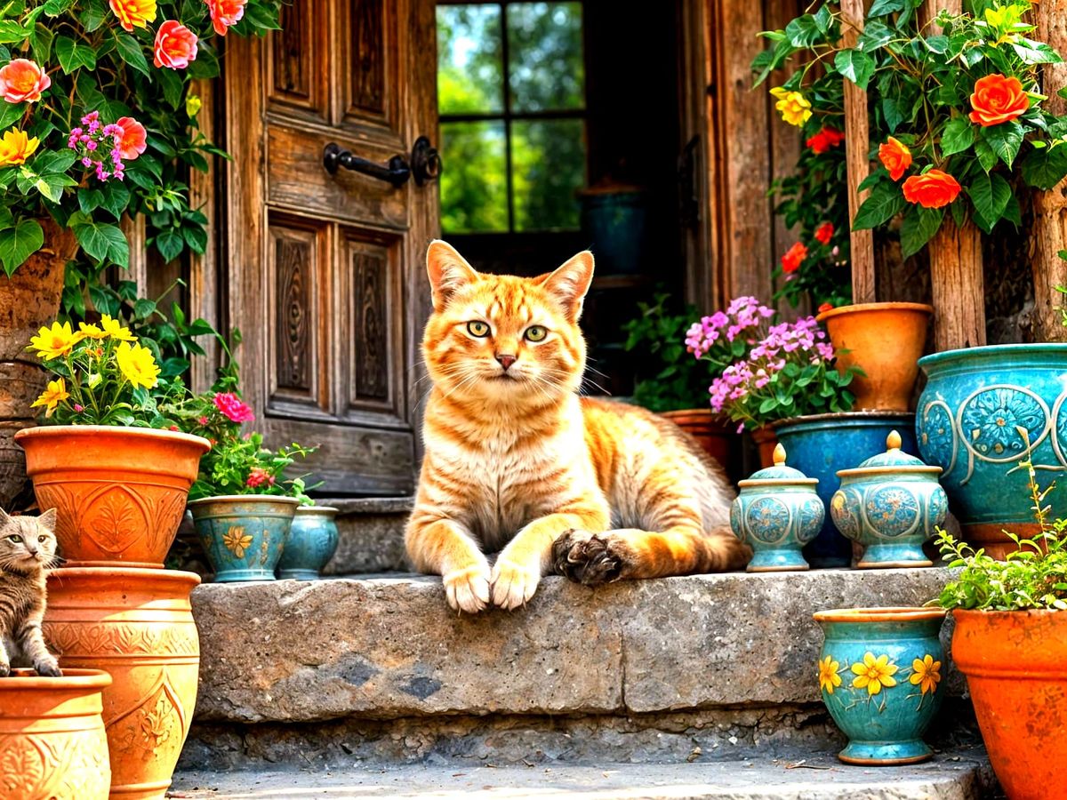 This image shows a charming feline sitting on the steps of a beautifully detailed antique garden shed, surrounded by vibrant flowers and lush greenery, in a stylized watercolor and alcohol ink aesthetic.
