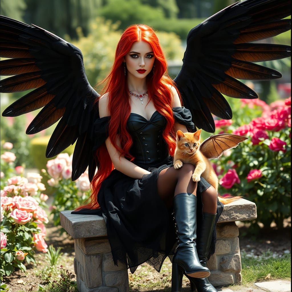 This image shows a beautiful female goddess with long flowing red hair, black wings, and striking makeup, sitting on a stone bench amidst a serene rose garden, surrounded by a ginger kitten with small wings and cinematic film-inspired lighting.