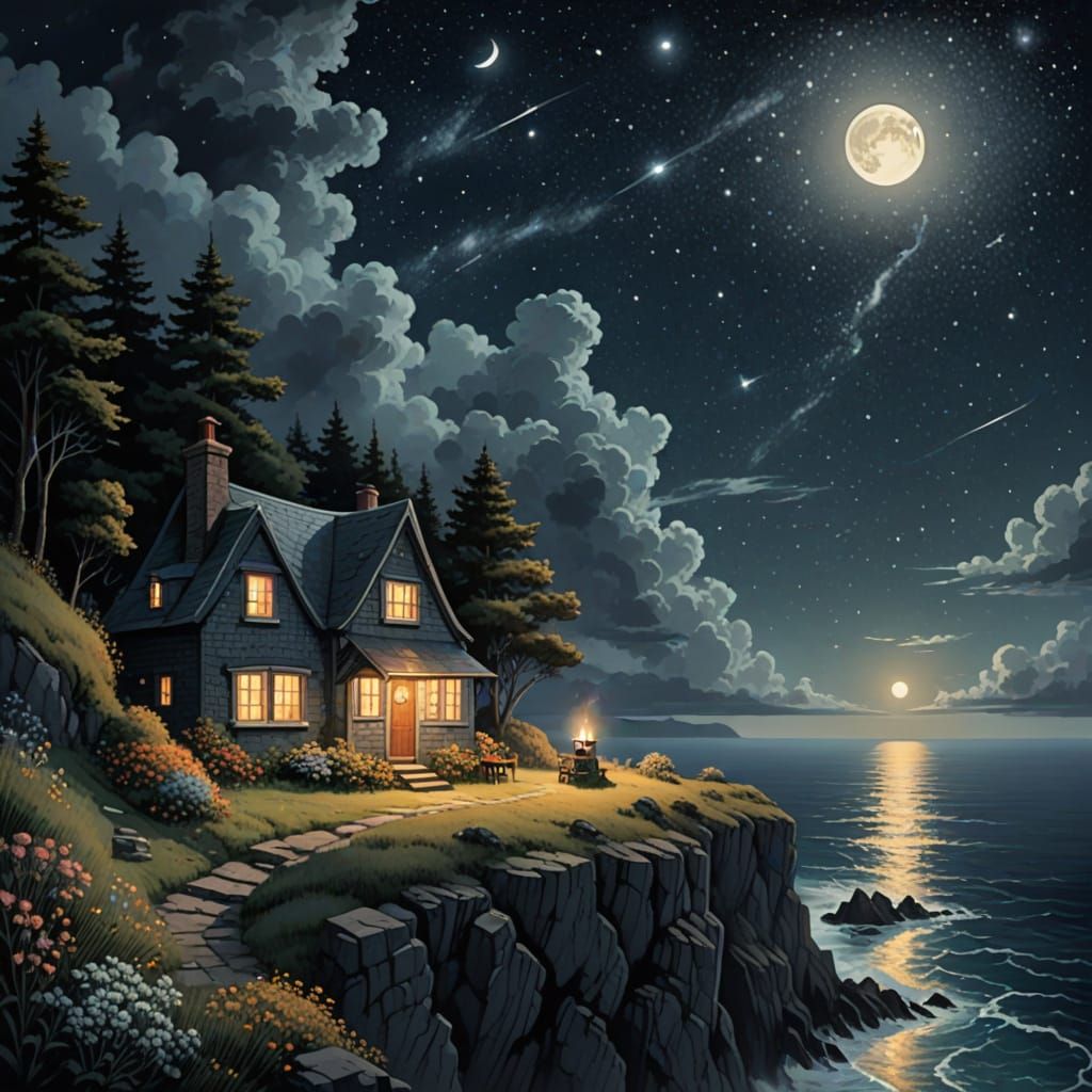 A small cottage on a sea cliff. Smoke puffs from the chimney. Only candlelight comes from the cottage. The night sky is the milky way over t...