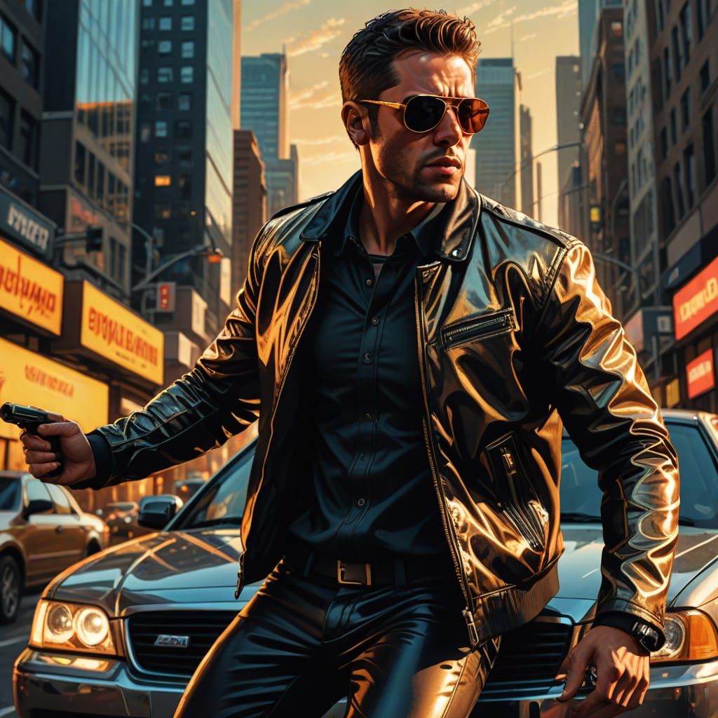 This image shows a bodyguard leaping from a car window in a dynamic, action-packed scene. Rendered as hyperrealistic digital art, it features comic book illustration style, reflective sunglasses, and golden hour lighting.