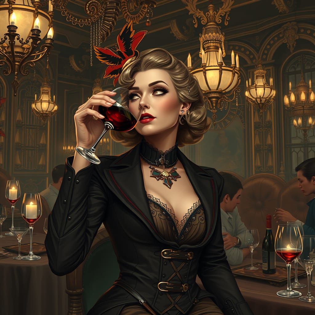 A striking picture of a woman at a dieselpunk party. She is wearing tailored attire while sipping wine, with ornate decorations in an art nouveau aesthetic.