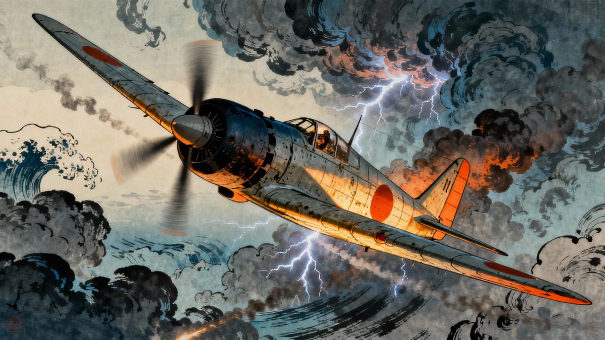 This image depicts a Japanese Zero fighter plane flying through stormy clouds, rendered with bold ink lines and a dramatic color palette, evoking an expressionistic style.