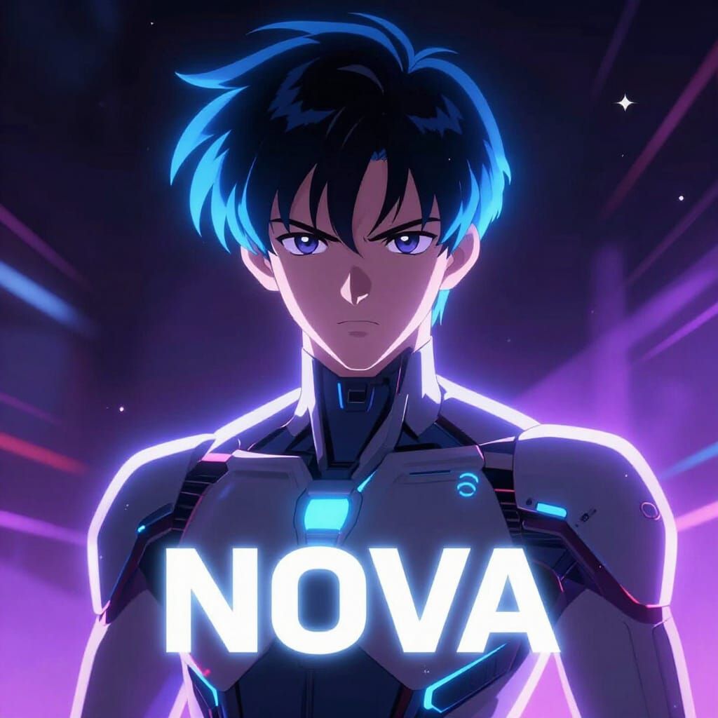 This image features an anime-style AI with a glowing aura and sleek, futuristic body. The name 'NOVA' is displayed prominently below the face, rendered with vibrant colors and dynamic lighting.