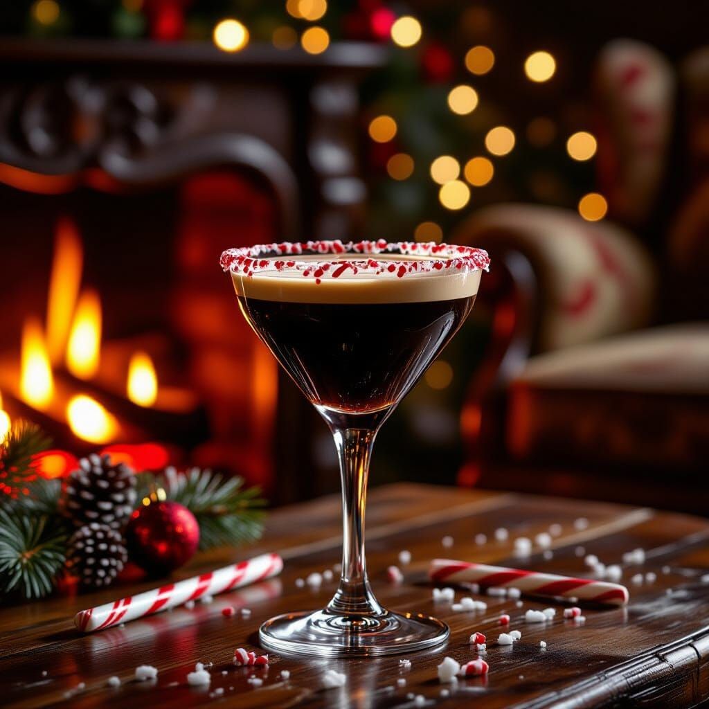 This image shows a photorealistic espresso martini in a glass with a crushed candy cane rim, placed on a rustic wooden table. The scene is set for Christmas with a fireplace and armchair, captured with cinematic realism.