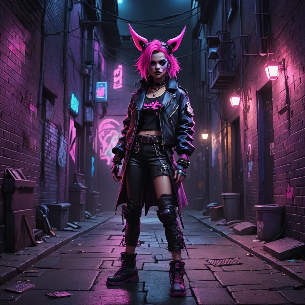 A 3D digital art image of a character in a gothic punk outfit posing in a dark alley. The scene is illuminated with neon pink, blue, and purple hues with bright black accents.