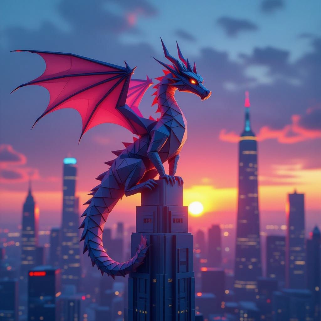 This image shows an origami dragon atop a futuristic city at sunset. The artwork features sharp focus and vibrant colors, with intricate paper folds and glowing neon accents in a digital art style.