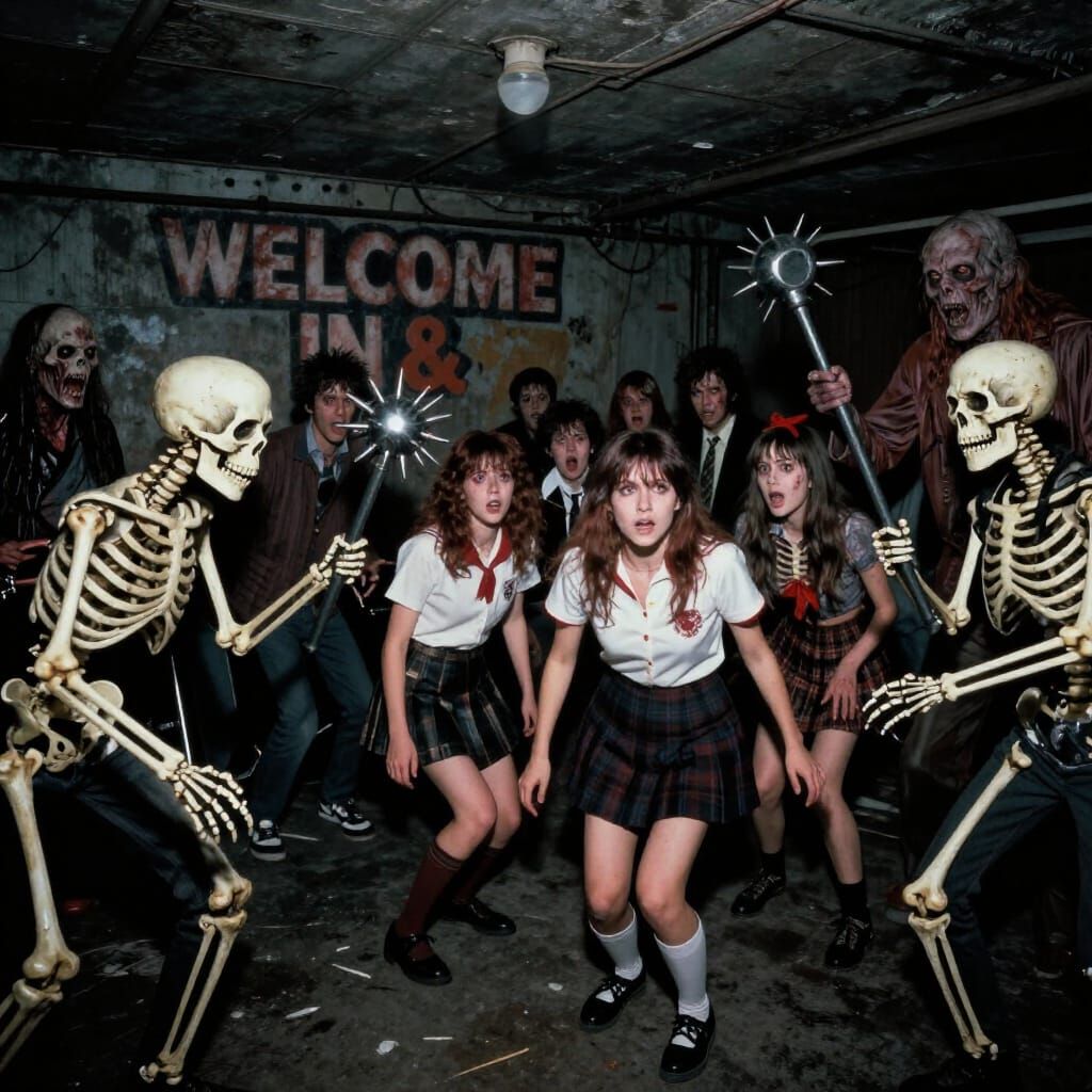A candid action photo capturing a basement punk show with skeletal figures pursuing a group of terrified punks. The image evokes a gritty, nightmarish 80s cult VHS aesthetic with dramatic lighting and unsettling figures.