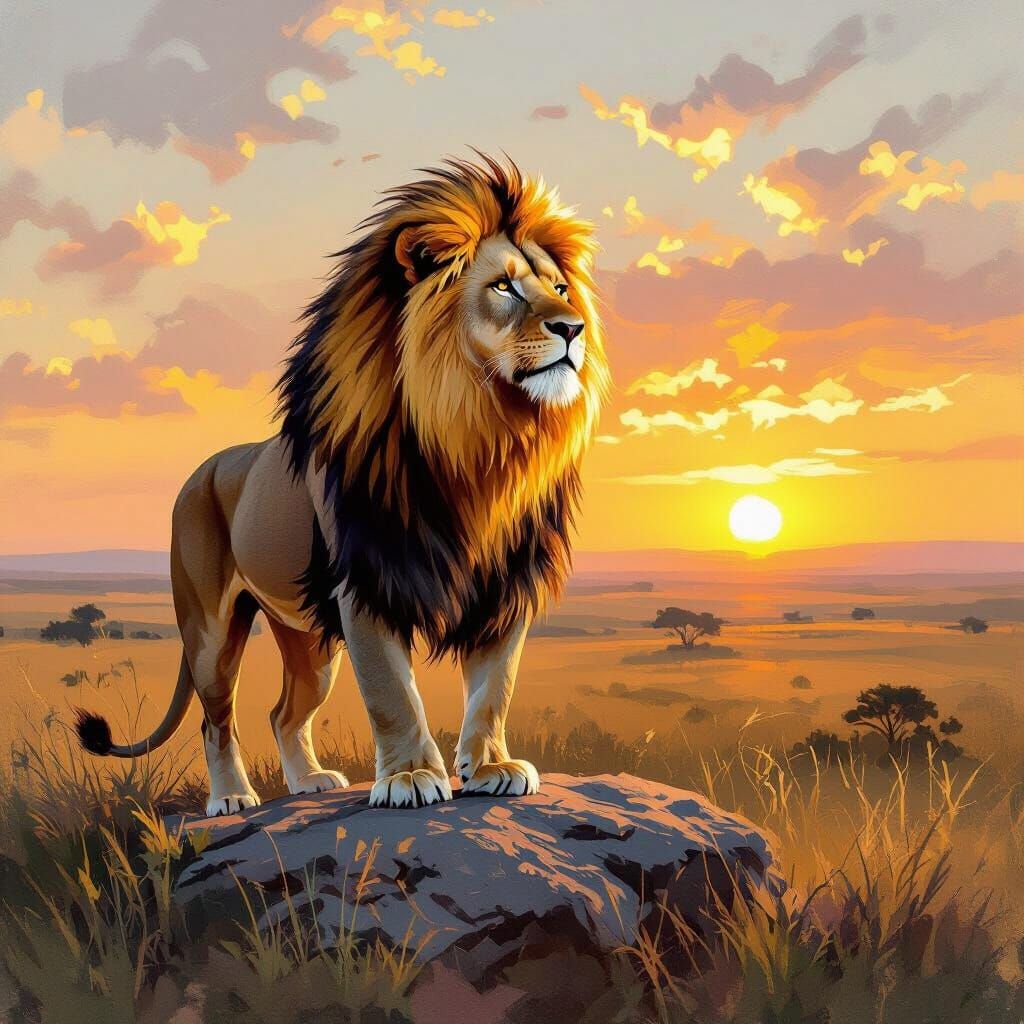 A majestic lion with a golden mane stands on a rocky outcrop overlooking a savanna at sunset. The scene is captured with impressionist brushstrokes and ethereal light.
