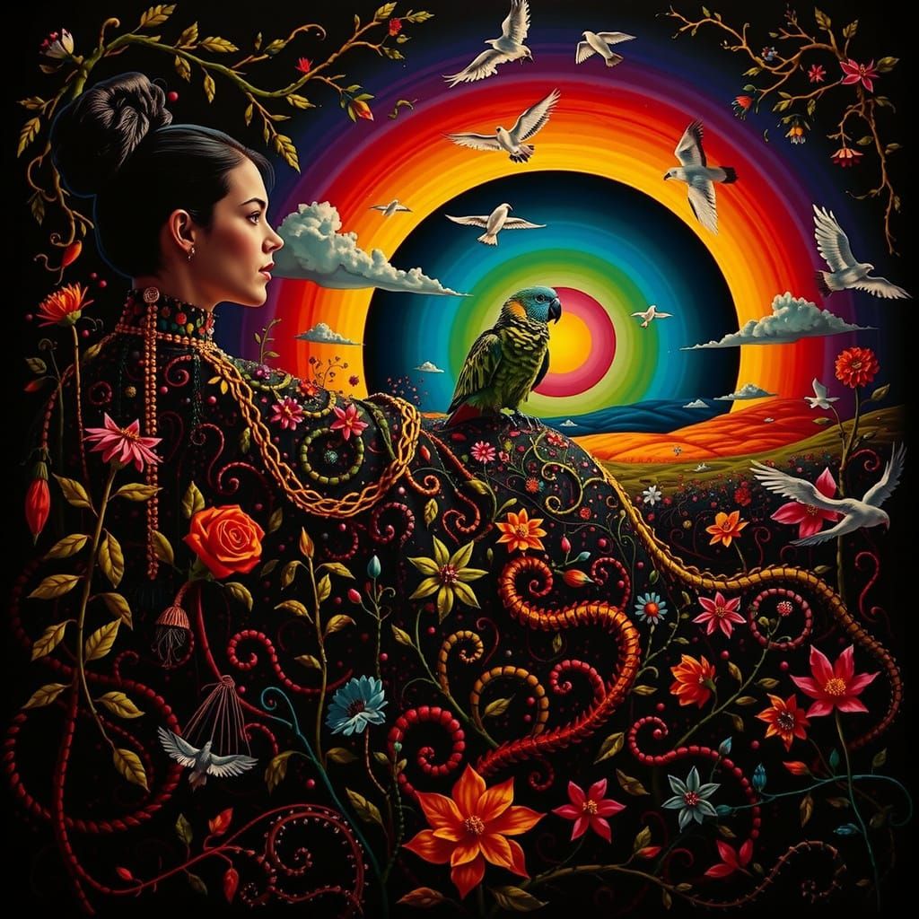 This striking image shows a chimaera figure with teal hair and a yellow flower against a vibrant sky and fields. Rendered in the intricate style of The Book of Kells, it evokes themes of life and infinity.