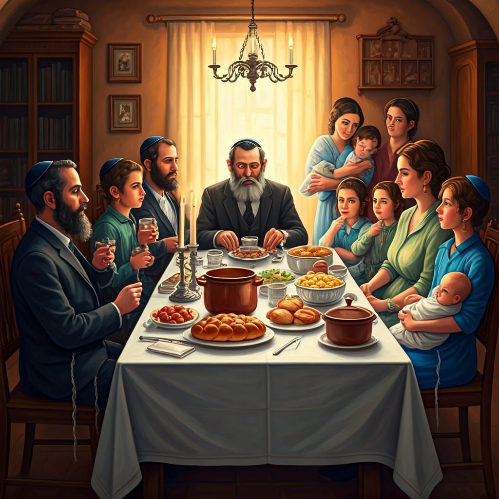 This image shows a family gathered around a long Shabbat table, complete with traditional foods and gleaming candlesticks. The scene evokes a warm, cozy atmosphere in a naive art style.
