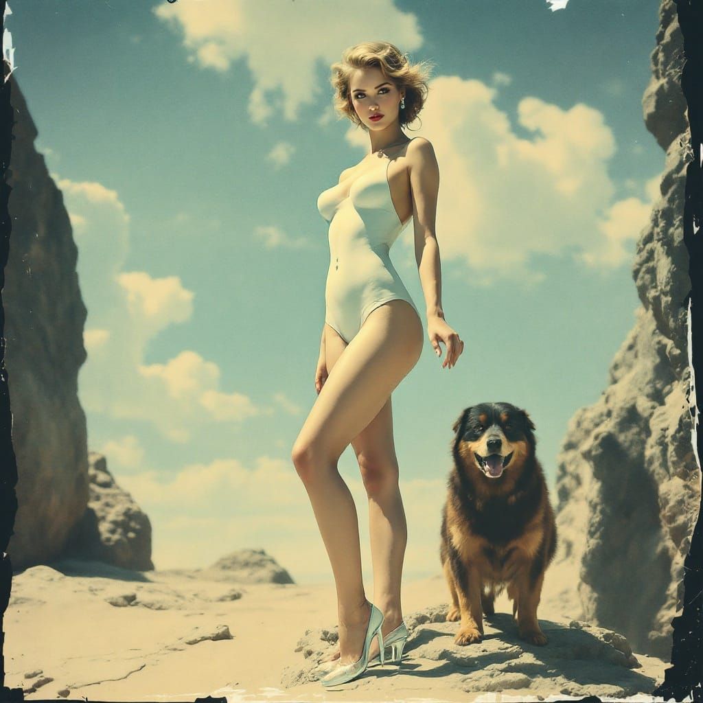 This image shows a modern take on a classic pin-up girl. A woman in glass slippers stands in a classic pose, rendered with watercolor-like textures and subtle color effects for a nostalgic yet contemporary feel.
