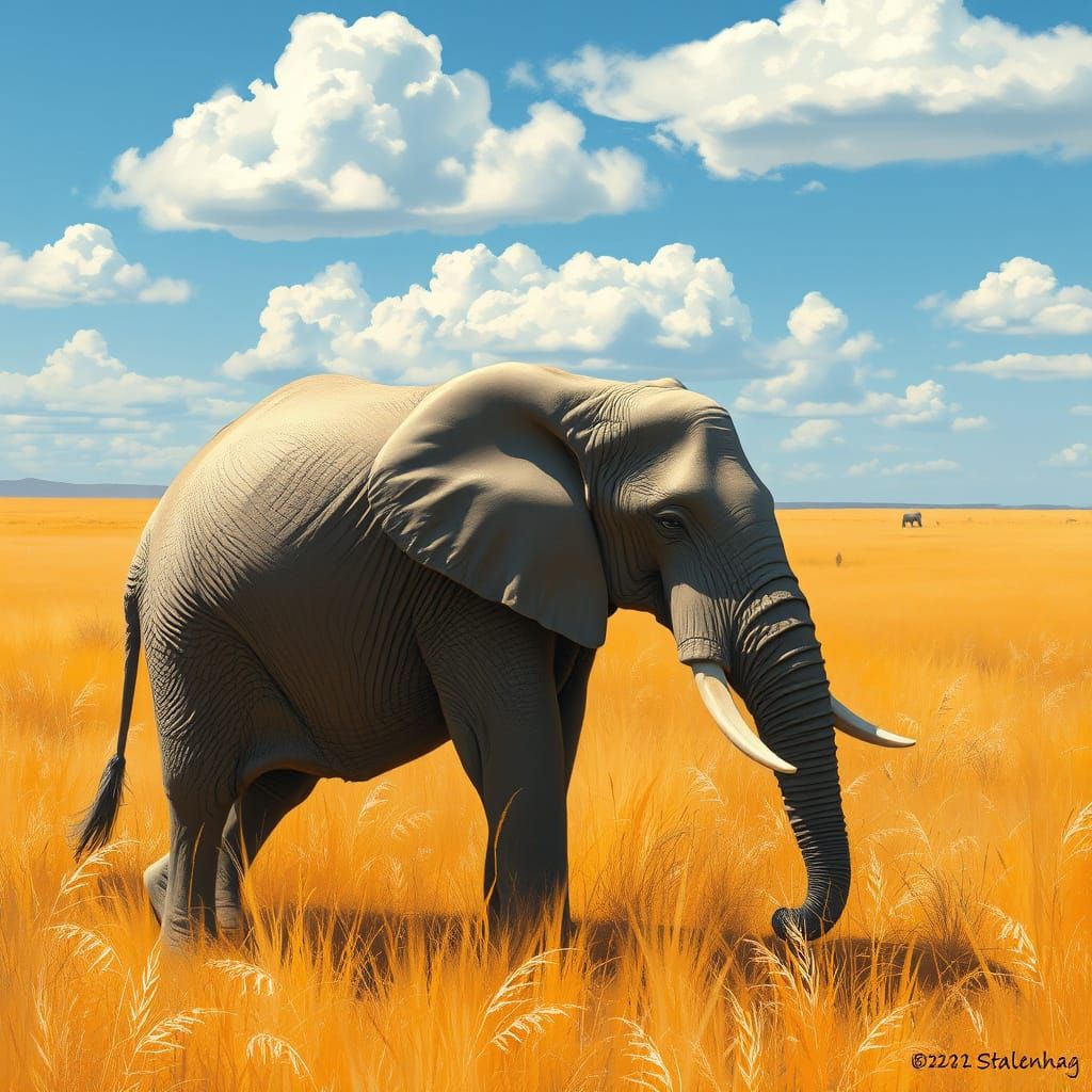A serene image of an elephant walking in a sun-drenched savanna, surrounded by tall golden grasses and fluffy white clouds, rendered in warm, earthy tones and soft brushstrokes, reminiscent of a peaceful African landscape.