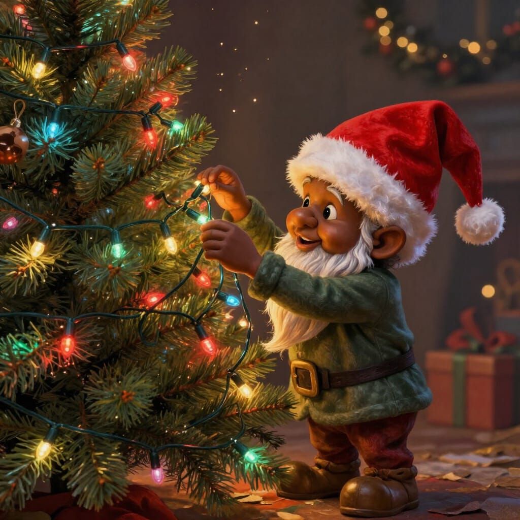 A charming illustration of an African American gnome playfully tangled in colorful Christmas lights while decorating a tree. Rendered in a whimsical storybook style with warm, magical lighting.
