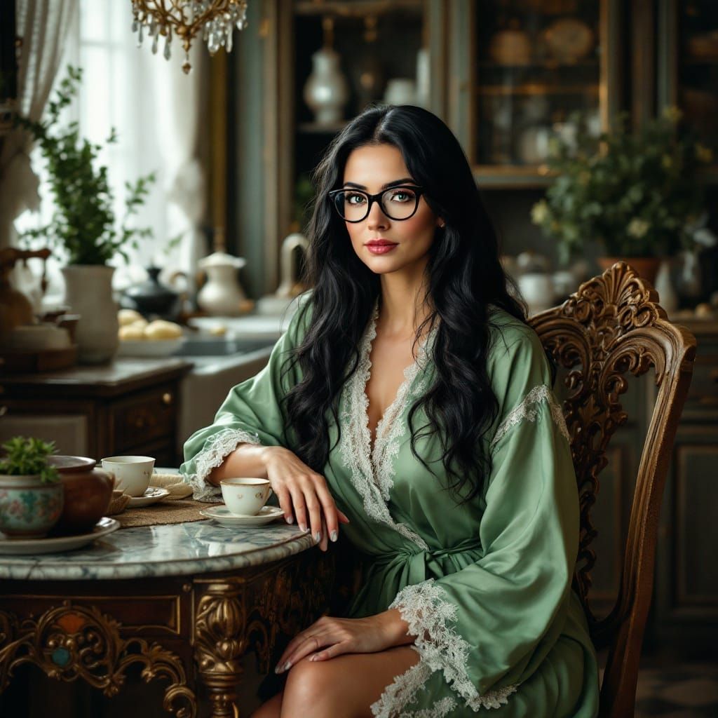 A detailed image of a middle-aged woman with long black hair and green eyes sitting in a Victorian-style kitchen. The artwork is reminiscent of art nouveau aesthetics.