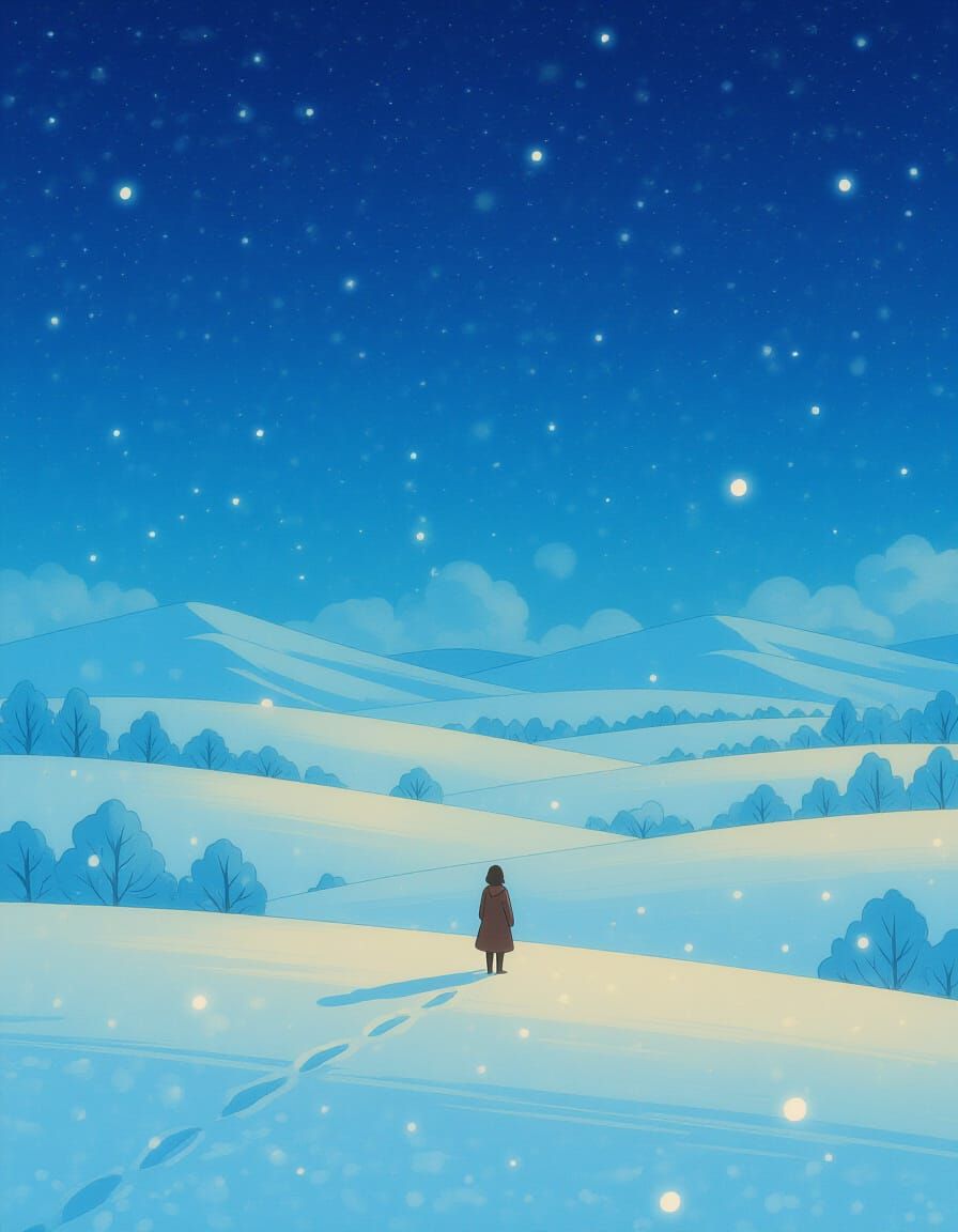 This image shows a snow-covered landscape under a starry sky, with glowing snowflakes falling gently. The artwork is reminiscent of vintage anime, creating a warm, nostalgic, and beautiful celestial scene.