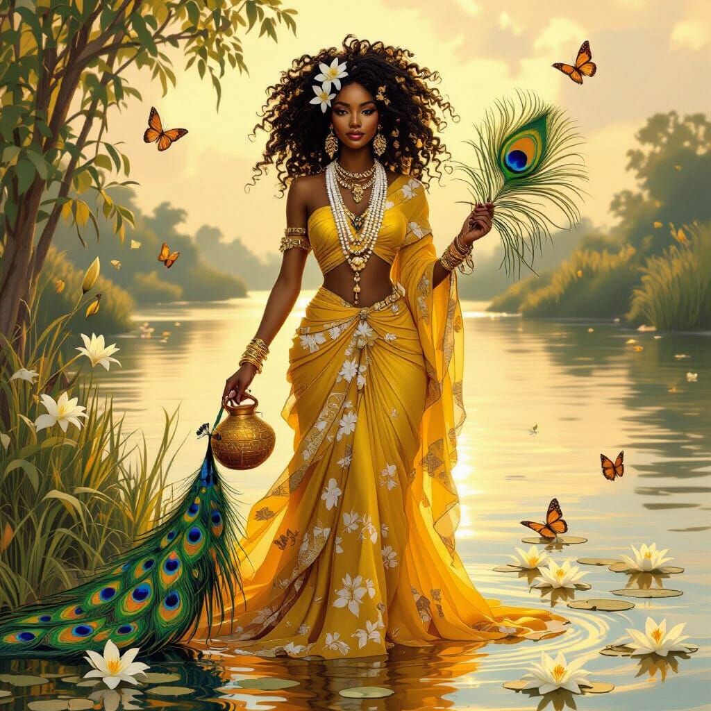 A beautiful depiction of Oxum, the African goddess of rivers and fresh water, standing near a riverbank. The goddess is adorned in gold and yellow with lilies and butterflies in this vibrant, ethereal portrait.