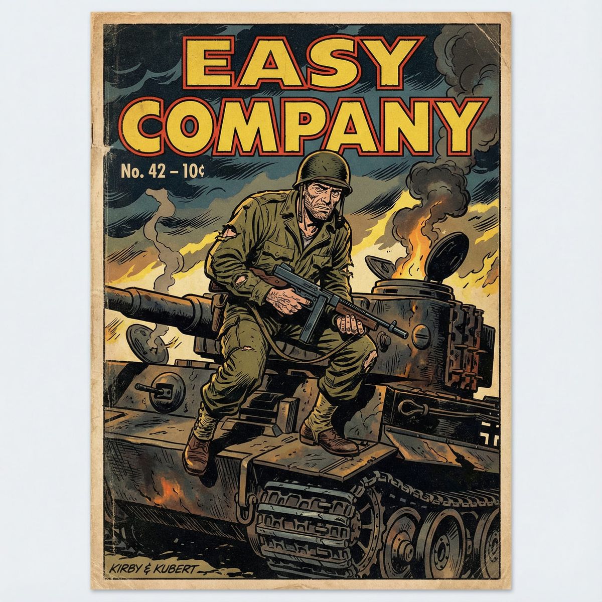 This image depicts an exhausted WW2 American soldier with a Grease Gun, sitting on a burned-out Tiger tank under a smoky sky. Rendered in classic comic book ink lines and desaturated colors.