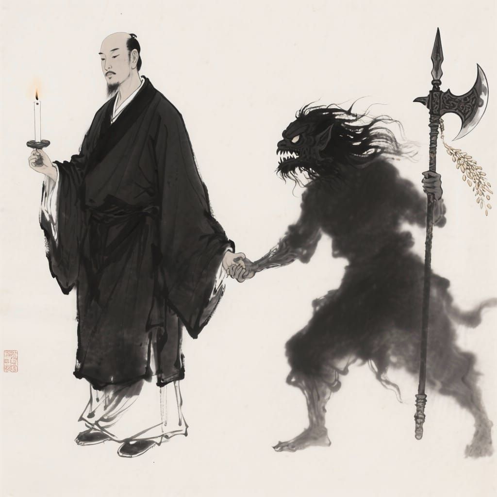 This minimalist ink portrait depicts a serene man in traditional robes holding a candle. His shadow, resembling a threatening demon, mirrors him with a halberd, set against aged rice paper texture.