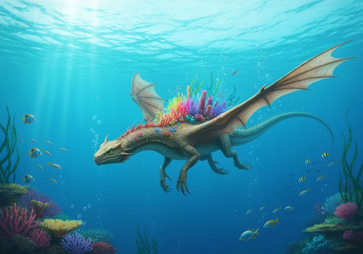 This image shows a majestic water dragon gliding underwater. The dragon's back features vibrant, rainbow-colored reefs, coral, and seaweed, all rendered with fantastical realism.