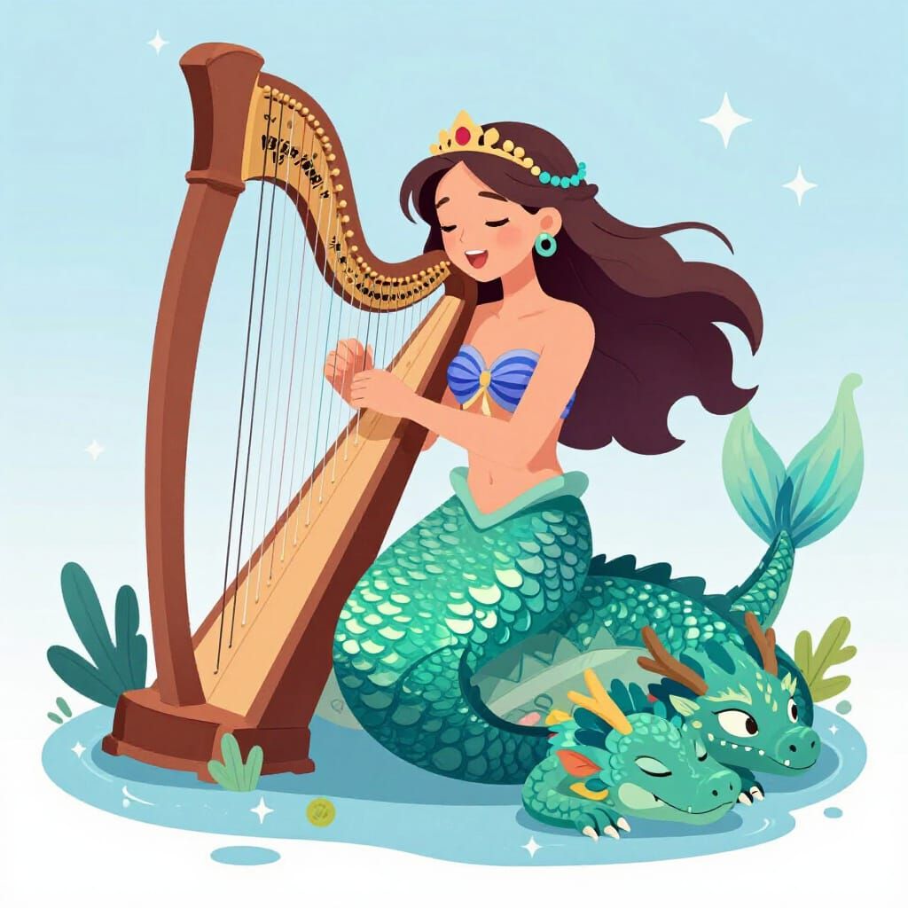This image shows an attractive mermaid playing a harp and singing a lullaby to a sleepy gem dragon. A serene and magical scene.