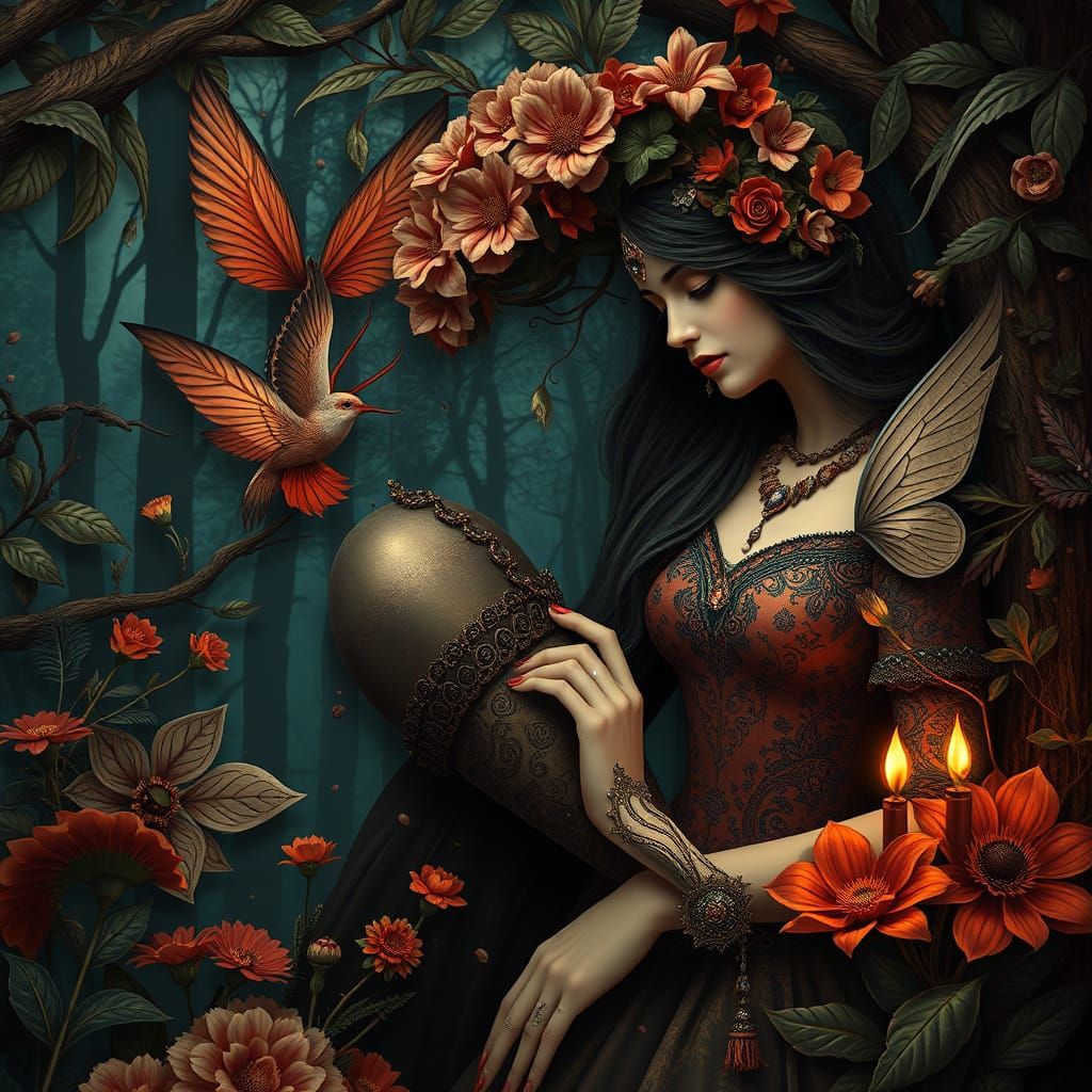 This enchanting image depicts a mystical, bohemian scene where forest creatures and goddesses interact amidst a tapestry of botanical images, intricate patterns, and ornate details. Rich, bold colors like dark blues and deep purples dominate the dramatic, hyperrealistic artwork.
