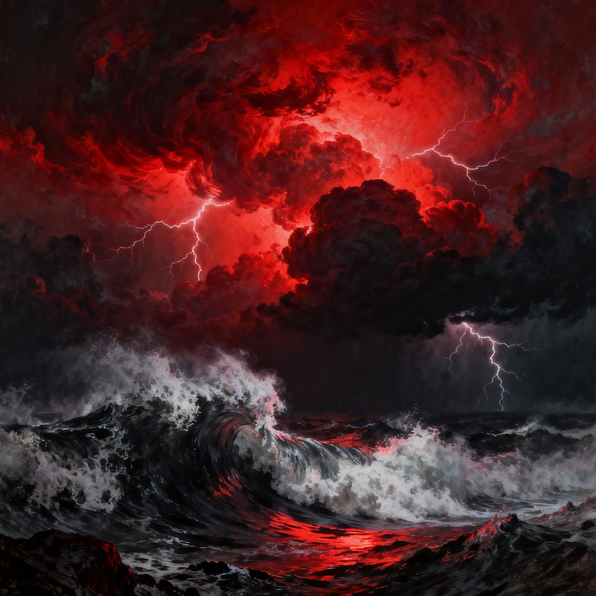 This image depicts a fierce crimson storm at sea with blood-red clouds, lightning, and massive waves. Rendered in a detailed, cinematic style with a dramatic glow, it evokes dark fantasy art.